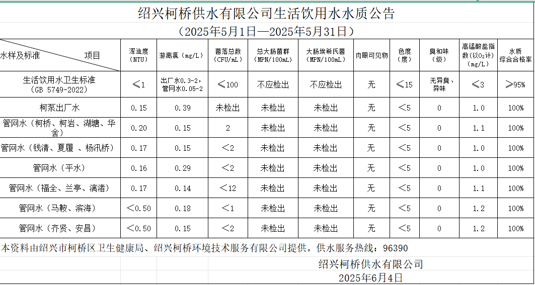 生活飲用水水質(zhì)公告(2025年5月1日—2025年5月31日)