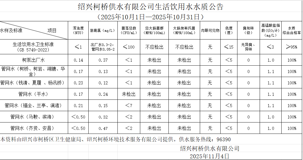 生活飲用水水質(zhì)公告(2025年10月1日—2025年10月31日)