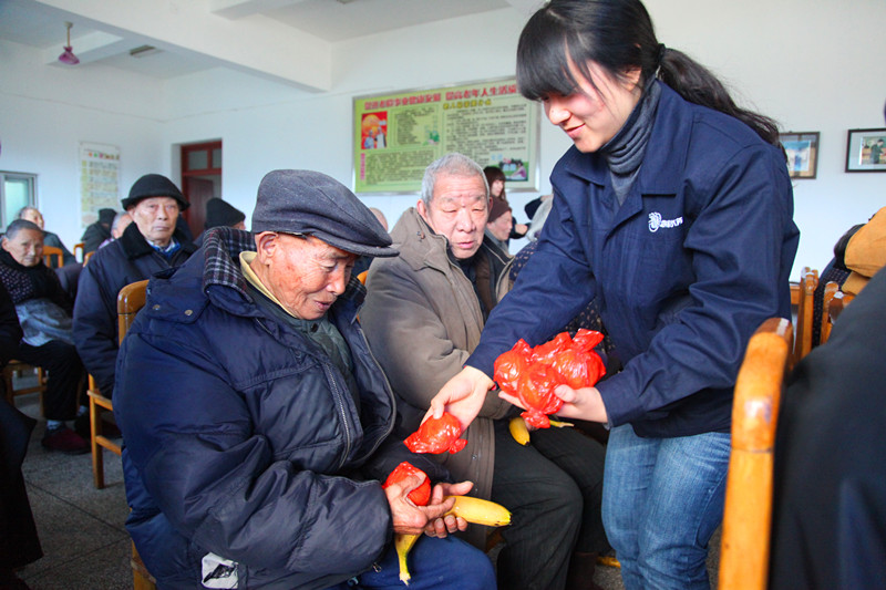 志愿者為夕陽紅敬老院老人分發(fā)水果、毛巾等物品