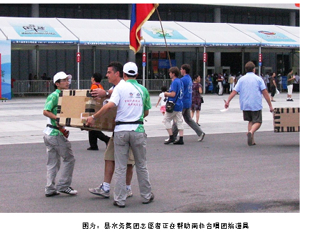 檢票口通道處突然出現(xiàn)個(gè)頭頂大箱的外國(guó)人,看他很吃力的樣子,隊(duì)員主動(dòng)向前提供幫助,經(jīng)過(guò)一番的交流,得知該團(tuán)隊(duì)是來(lái)自南非的合唱團(tuán),搬大箱子的是該團(tuán)的指揮,里面裝著的是南非民族樂(lè)器打鼓,是今天晚上表演的道具,隊(duì)員們將沉甸甸的大箱打鼓搬運(yùn)到了舞臺(tái)幕后。