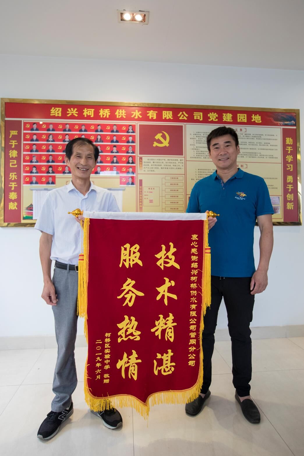 為助力中考,管網分公司立即派出技術精湛的檢漏班組長上門服務。經過一系列檢查,于當晚查出校內供水管道漏點3個,切實解決了柯橋實驗中學的用水問題。熱情服務的態度和精湛的檢漏技術得到了實驗中學的肯定和點贊。為此,6月12日,該校總務科長李強代表柯橋實驗中學向管網分公司送上錦旗,以表感謝。